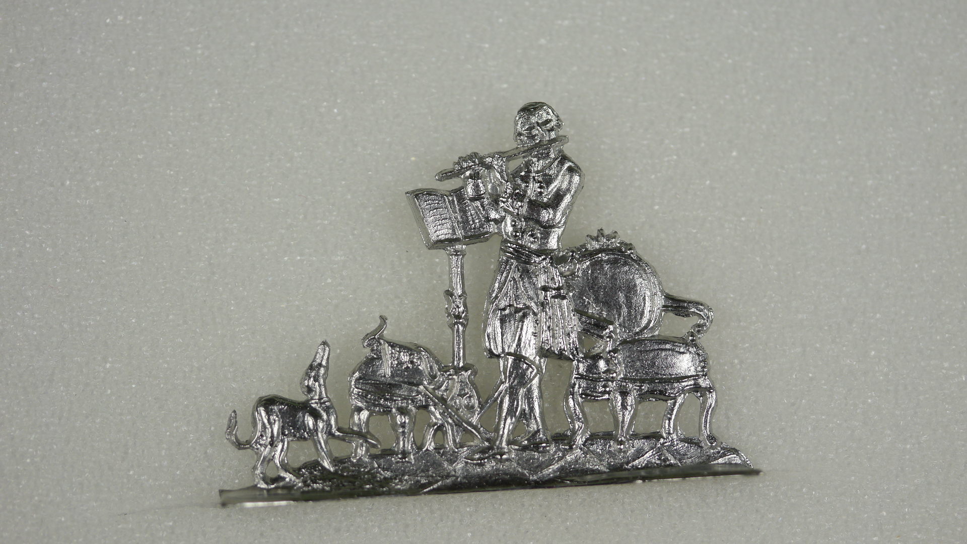 Friedrich II., Flöte spielend, mit Notenpult, Stuhl, Schemel und Windhunden